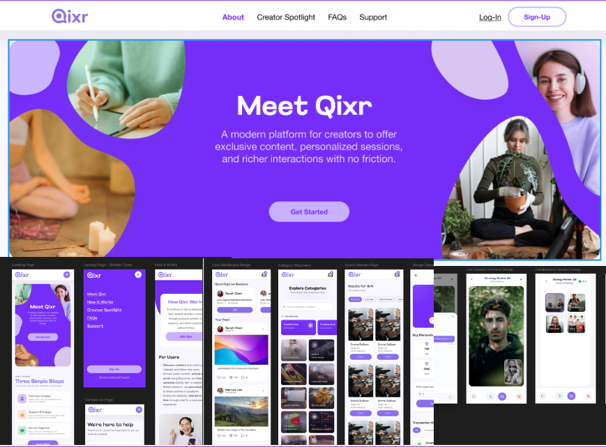 A fan lands on Qixr, browses creators by category (fitness, music, business, education, etc.), and opens a creator profile. They see the creator's services, upcoming availability, exclusive posts, and reviews from other fans.